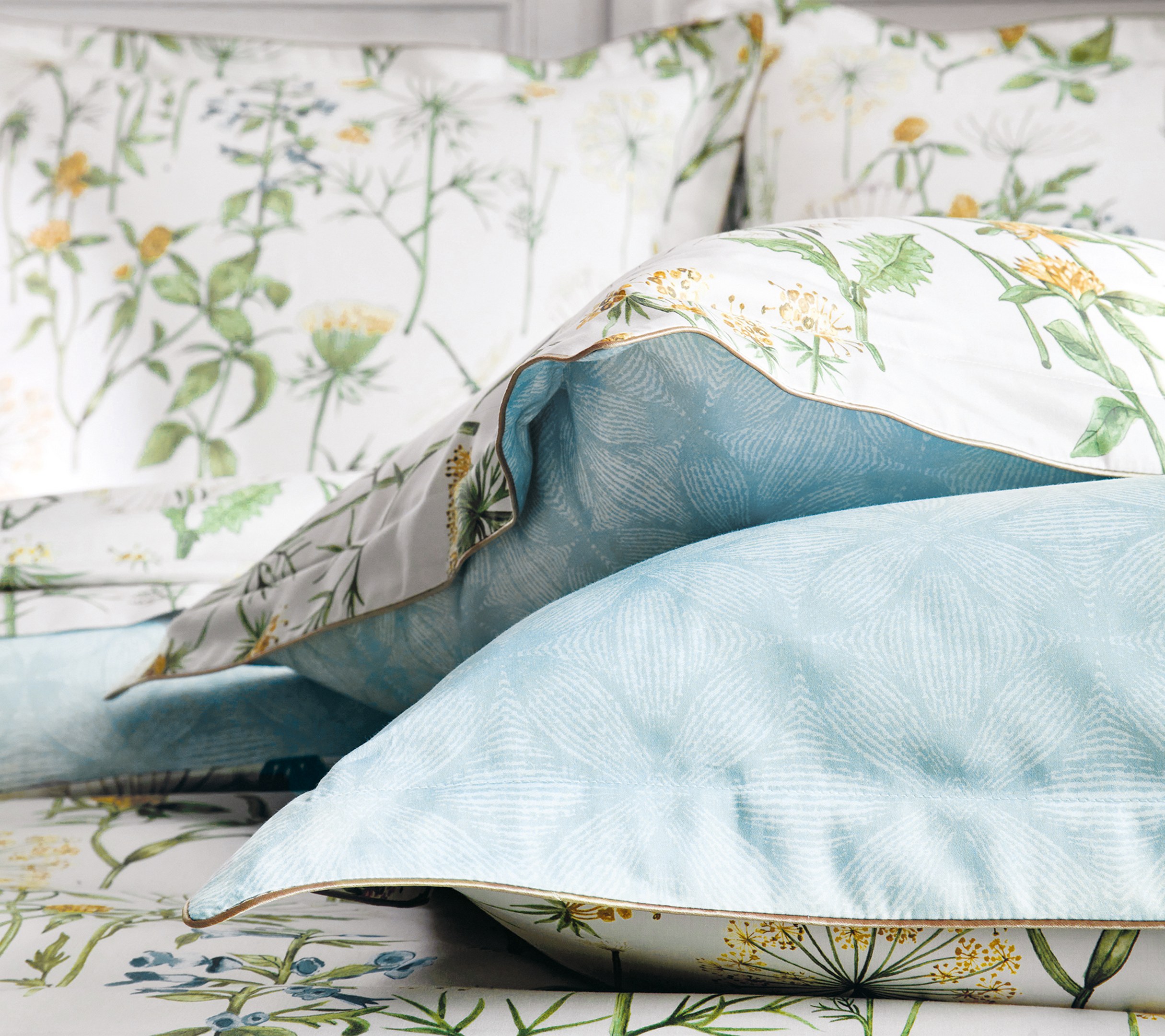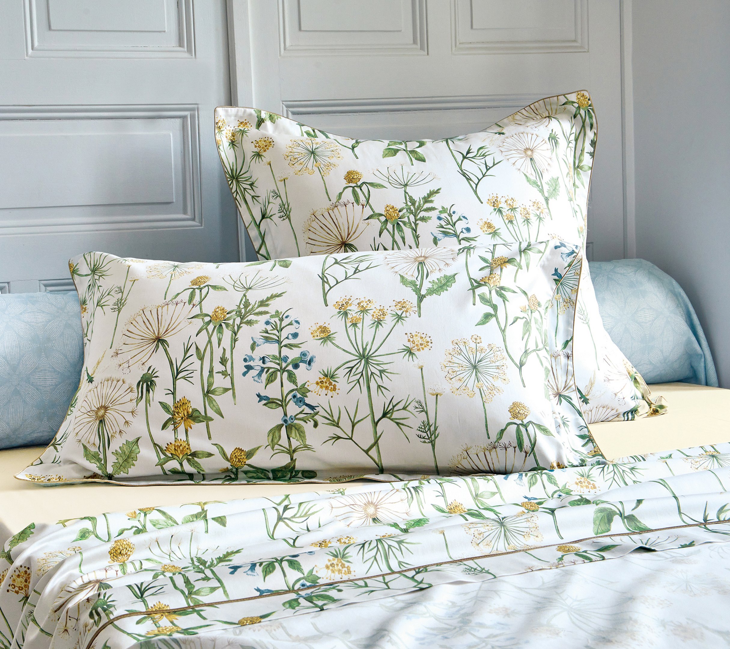 Issue du prestigieux univers de la maison anglaise SANDERSON, le drap ANGELICA célèbre l’élégance intemporelle des jardins anglais. Son motif raffiné de fleurs et feuillages, décliné dans de subtiles nuances de bleu et de vert tilleul, apporte fraîcheur et douceur à la chambre, tout en créant une atmosphère apaisante et lumineuse.