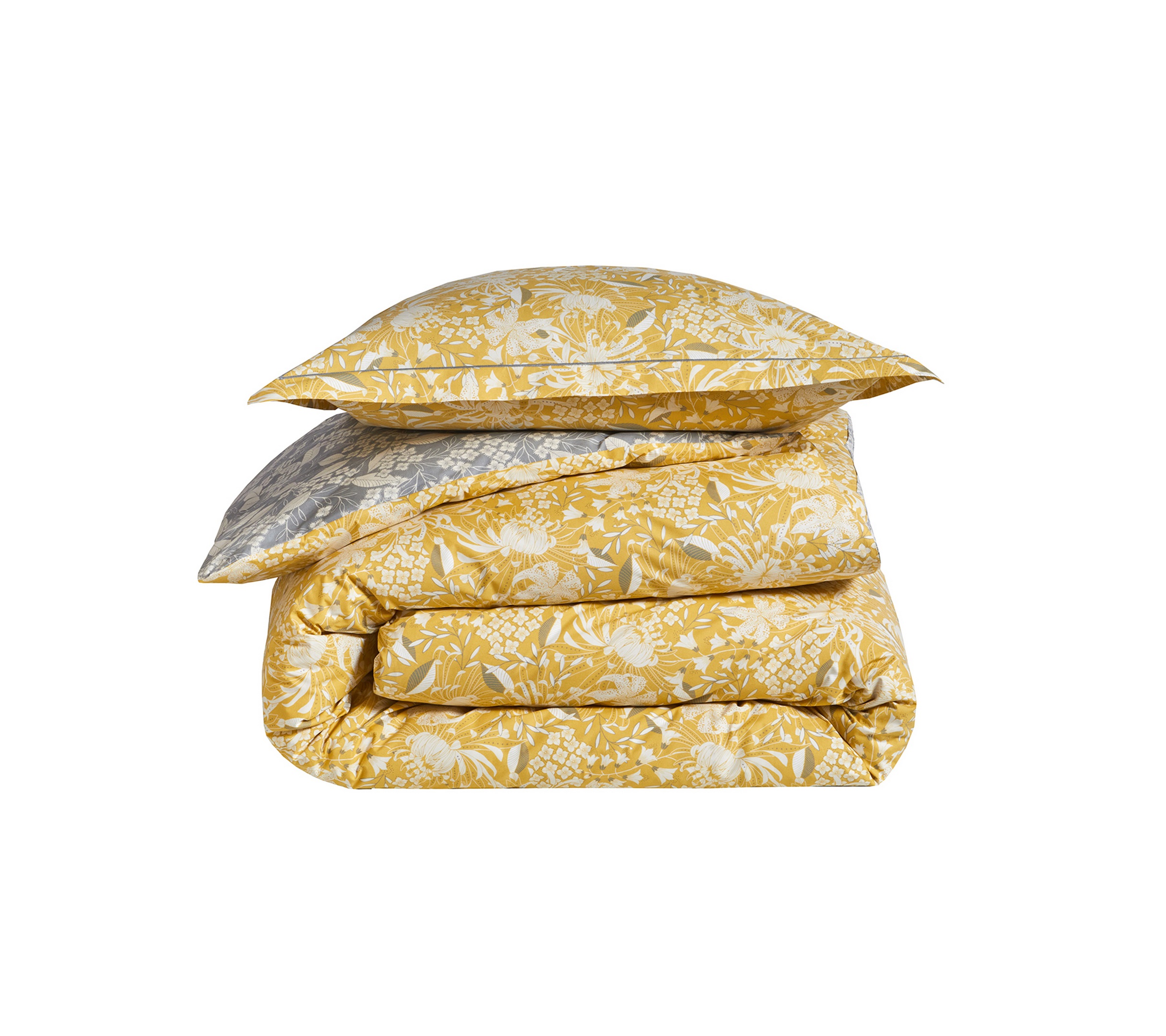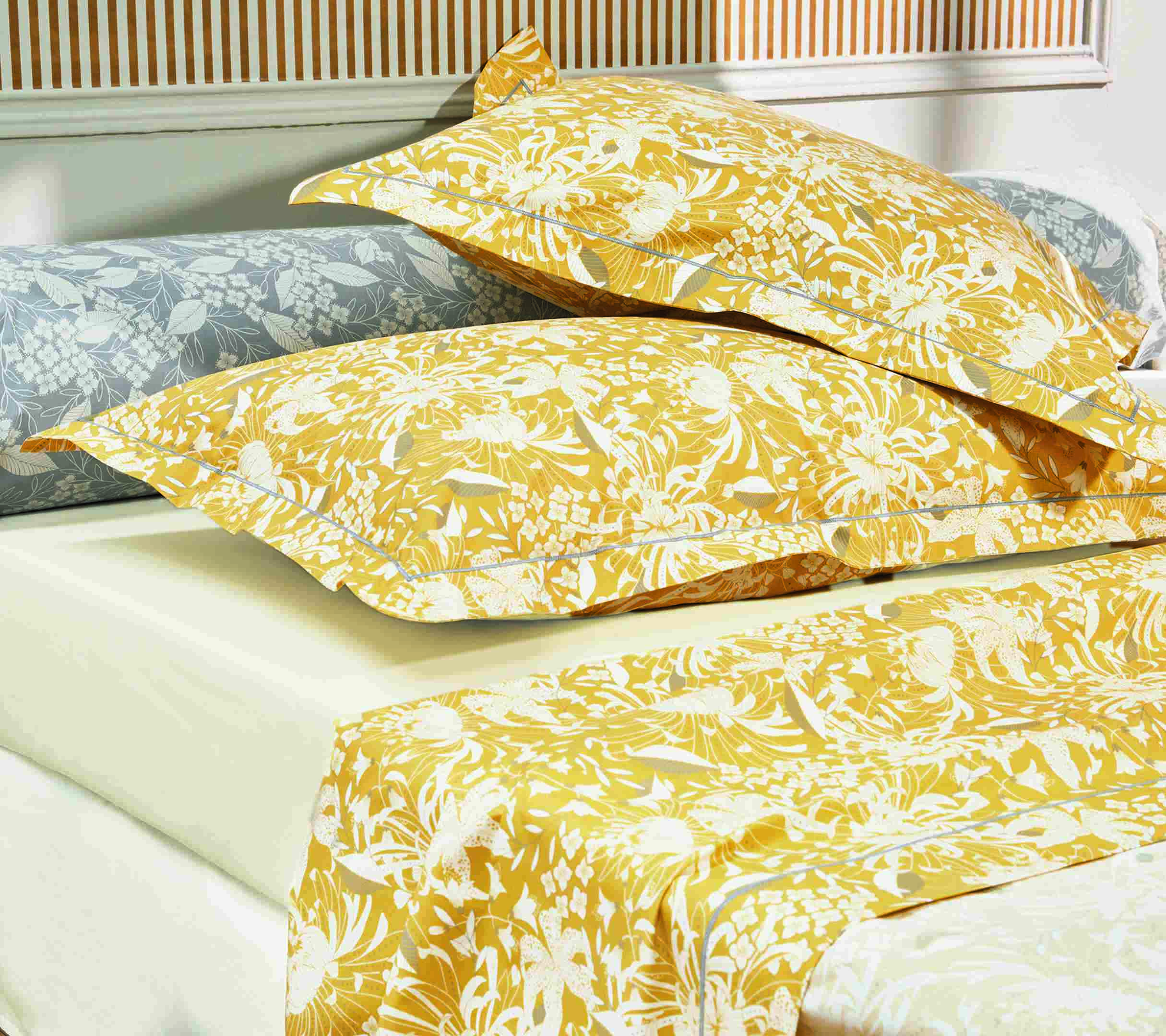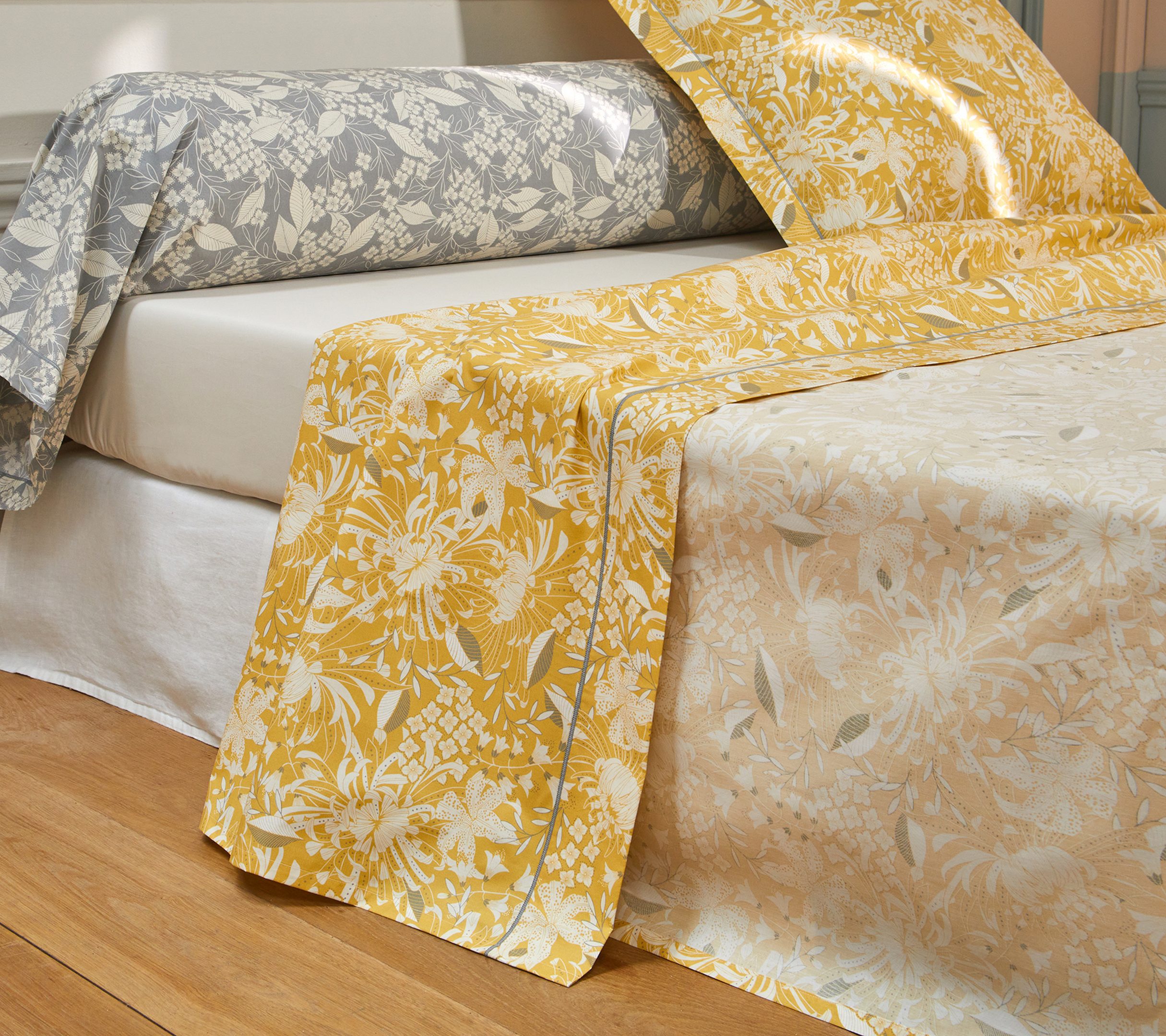 Inspirée par le charme authentique des maisons de campagne provençales, la parure BASTIDE soleil évoque l’art de vivre du Sud, entre élégance intemporelle et dolce vita. Ses motifs floraux stylisés, délicatement dessinés dans des tons de jaune et de gris, rappellent les jardins méditerranéens baignés de soleil et diffusent dans la chambre une atmosphère chaleureuse, apaisante et raffinée.
