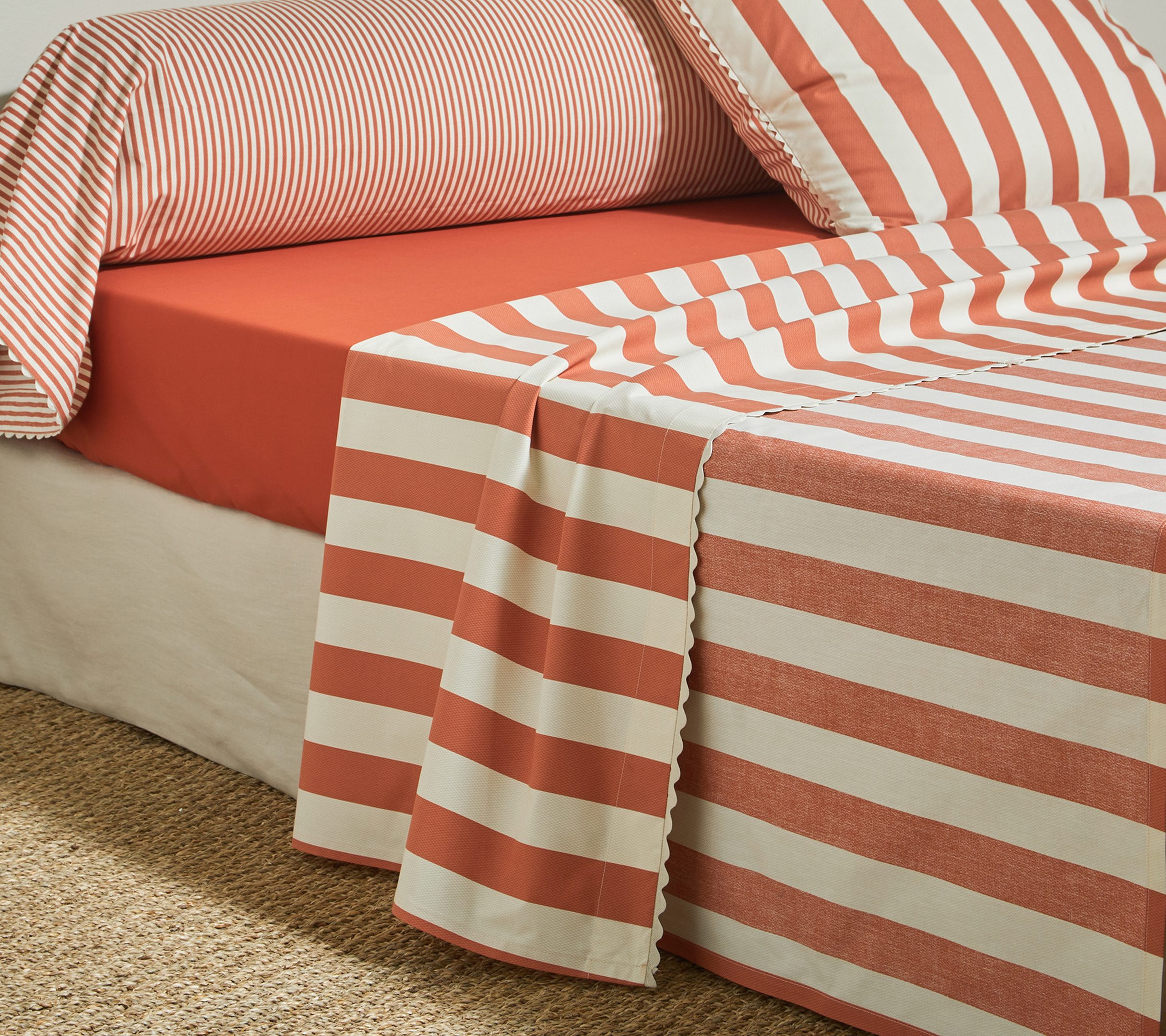 Décliné en deux coloris harmonieux : Terracotta, chaleureux et solaire, et Chanvre, naturel et apaisant, le drap plat BELLA VITA s’intègre aussi bien dans un univers classique que dans une décoration plus contemporaine.