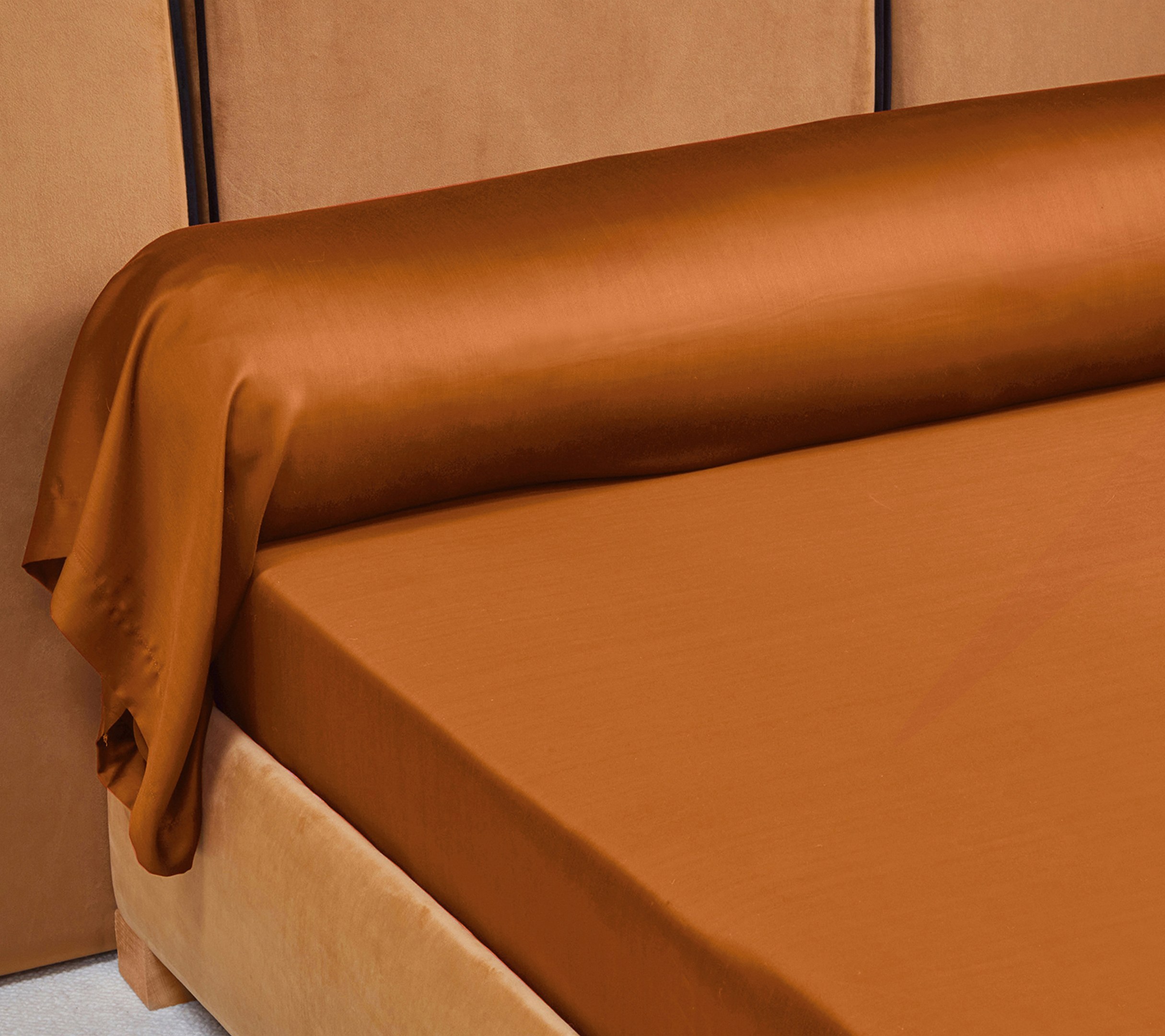 Le drap-housse MOUSSON Cognac douceur naturelle et élégance colorée découvrez notre gamme de linge de lit en satin Tencel.