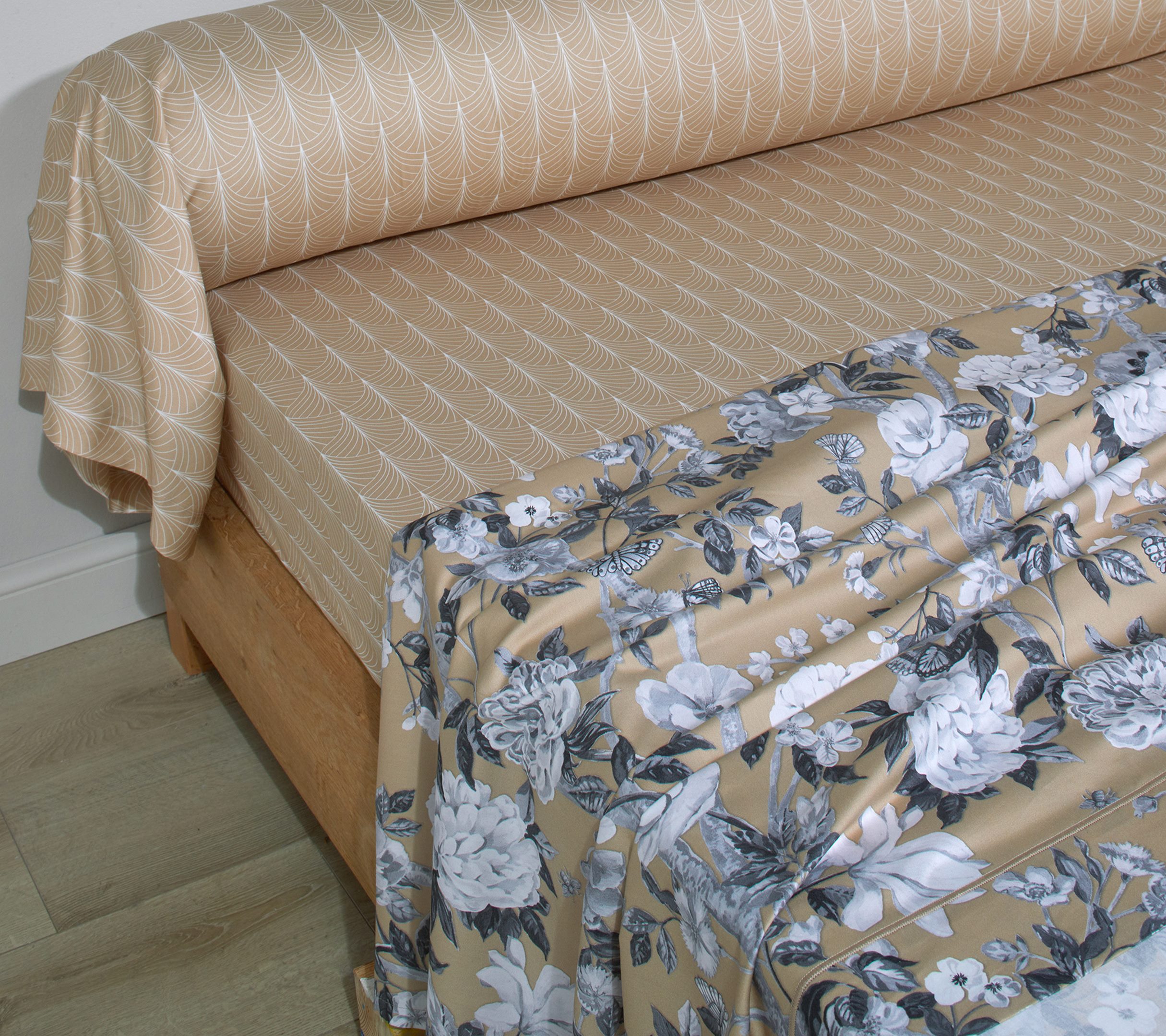 Drap 180/290 cm Satin 100% coton peigné longues fibres 120 fils/cm² . Notre modèle Impérial, marie des motifs floraux en noir et blanc avec des fonds aux teintes naturelles, créant une ambiance harmonieuse et raffinée.