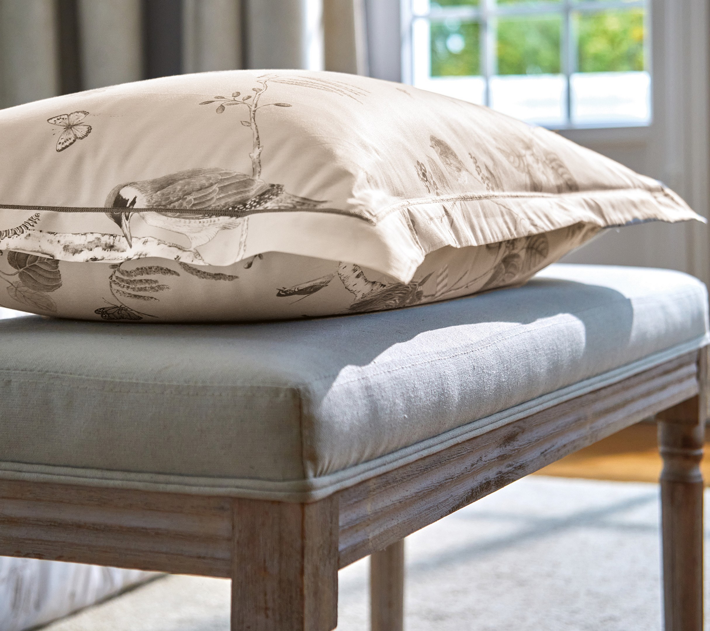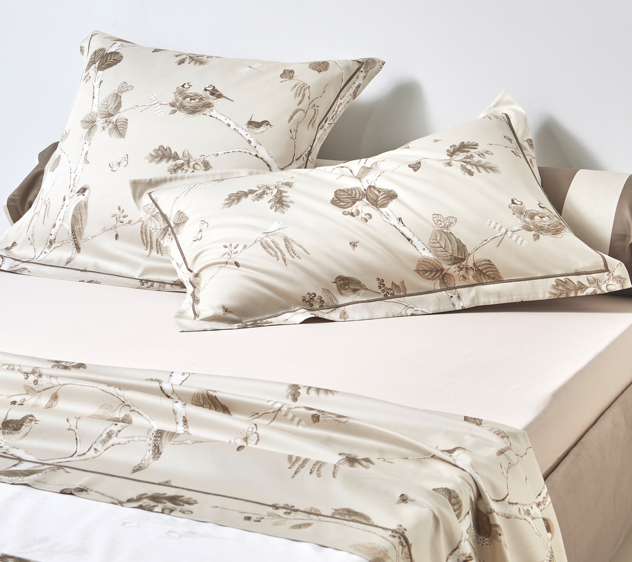 Rappelant la beauté des jardins anglais, le drap plat WOODLAND en satin de coton apporte à la chambre une atmosphère raffinée et naturelle. Ses motifs délicats d’oiseaux et de feuillages, inspirés des paysages des cottages anglais, créent un décor poétique et élégant, où chaque détail raconte le prestige et le savoir-faire de la maison Sanderson.