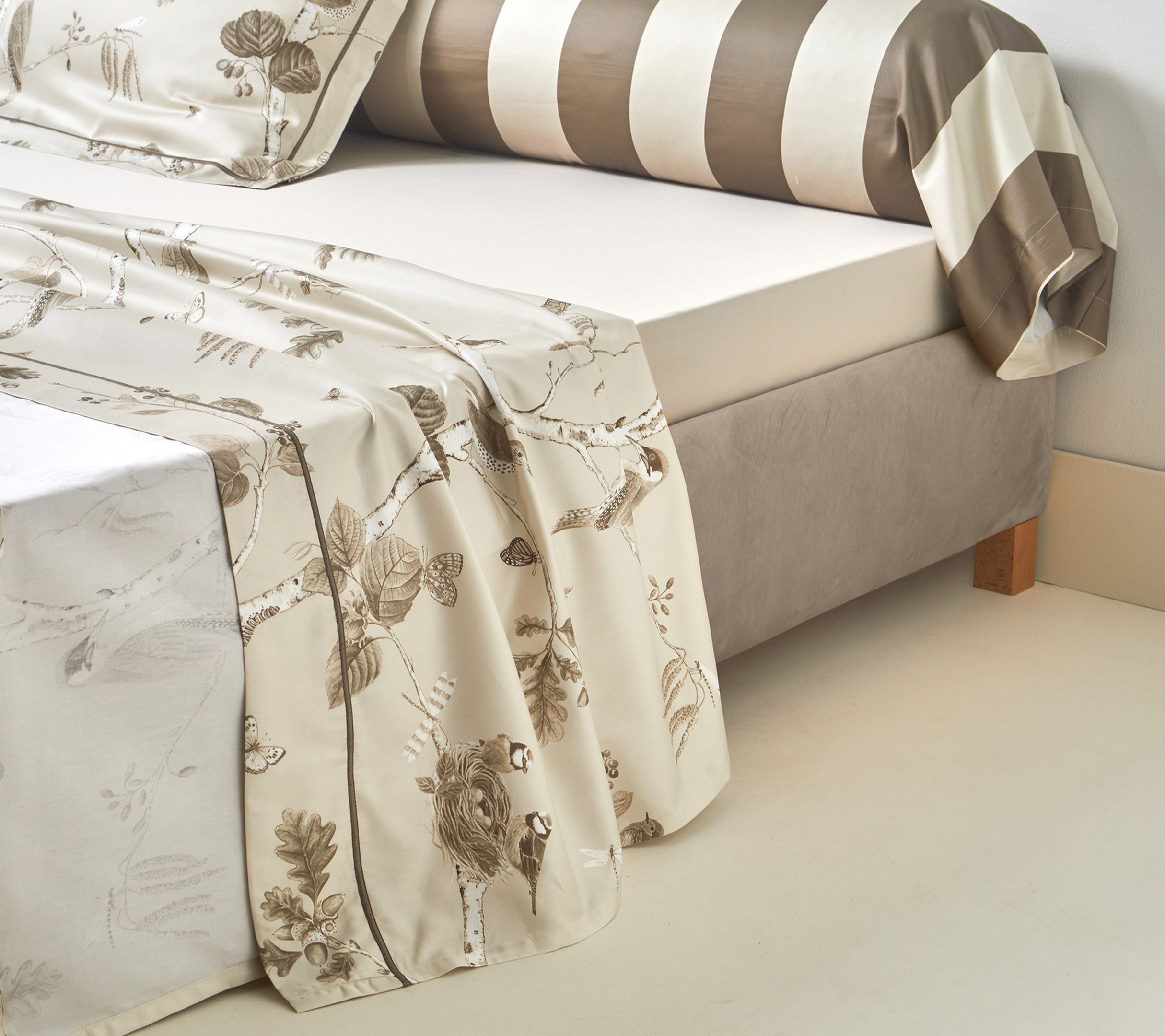 Décliné en deux harmonies subtiles : bleu céleste et sépia, le drap WOODLAND conjugue charme classique et modernité. Son revers à larges rayures bicolores, coordonnées aux teintes principales, apporte un contraste graphique raffiné et met en valeur le dessin du motif. Le drap plat est sublimé par un volant plat de 8 cm orné d’une broderie bourdon mèche, pour une finition soignée et contemporaine.