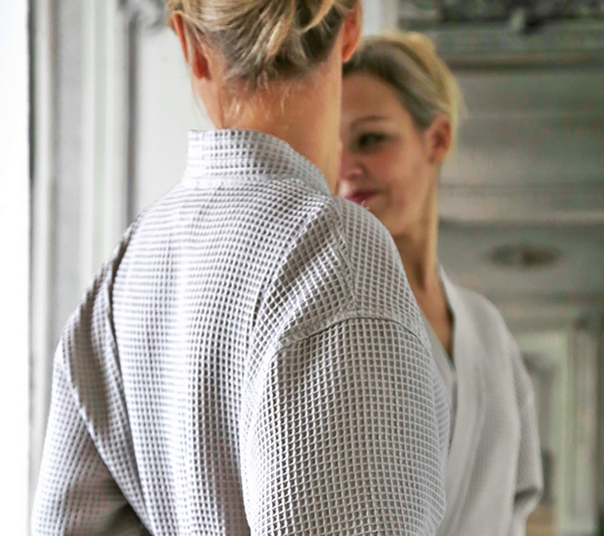 Le peignoir MANOIR vous séduira de par son raffinement et la légèreté de la maille nid d'abeille.
