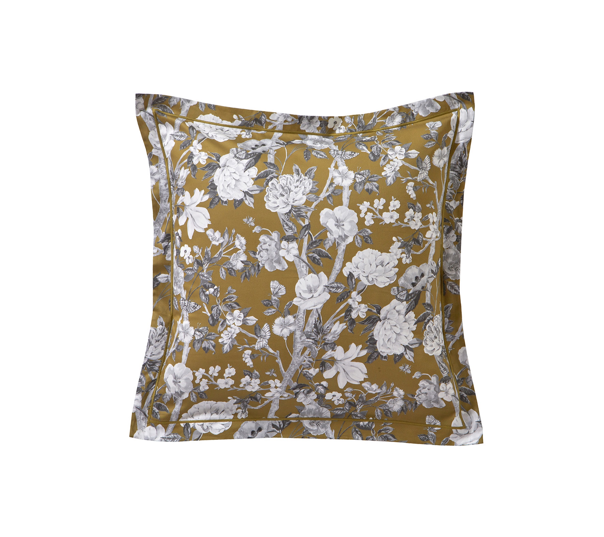 Taie 65/65 cm Satin 100% coton peigné longues fibres 120 fils/cm² . Notre modèle Impérial, marie des motifs floraux en noir et blanc avec des fonds aux teintes naturelles, créant une ambiance harmonieuse et raffinée.