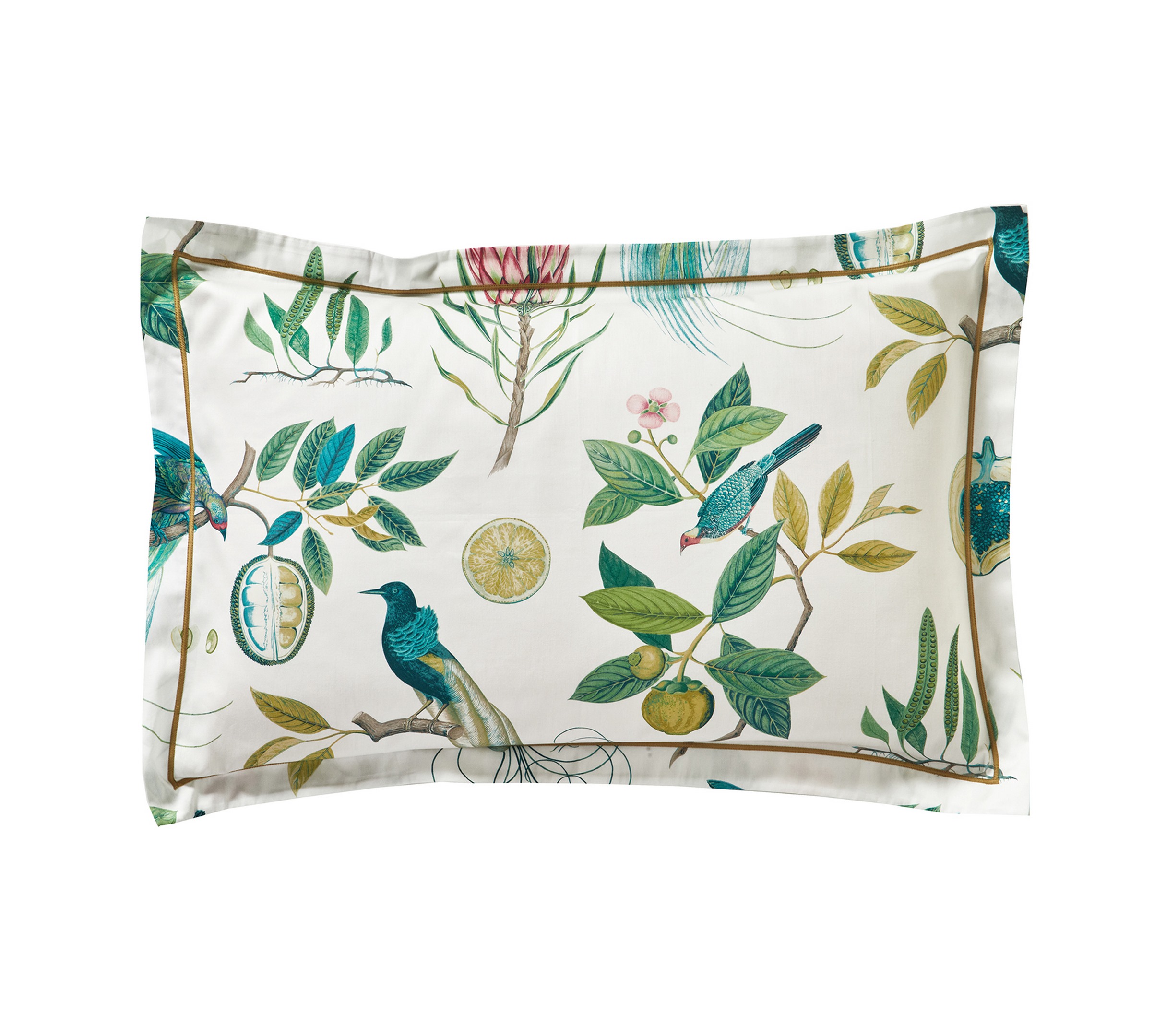 Taie 45/65 cm Satin 100% coton peigné longues fibres 120 fils/cm² . Le modèle Paradésia Ocre vous transporte au cœur d’une nature luxuriante. Une combinaison de motifs tropicaux d'une grande richesse avec une flore exotique et une faune vibrante, où les oiseaux de paradis, magnifiquement illustrés se cachent parmi les papayes, Proteas et aux autres plantes tropicales. Chaque détail de ce tableau vivant évoque un paradis lointain, tandis que le motif coordonné, un treillis géométrique structuré, apporte une touche de modernité et de contraste à l'ensemble.