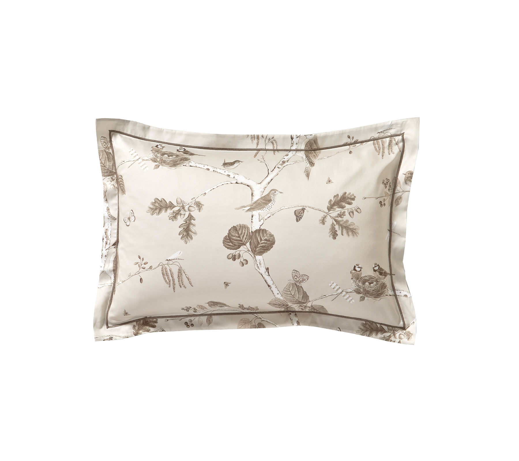 Taie 50/75 cm Satin 100% coton peigné longues fibres 120 fils/cm² Avec la taie d’oreiller WOODLAND en satin de coton, vous apporterez charme et poésie à votre chambre. Elle s’inspire des jardins anglais et de l’élégance intemporelle de la maison SANDERSON. Ses motifs délicats d’oiseaux et de feuillages créent une ambiance douce, raffinée et apaisante.